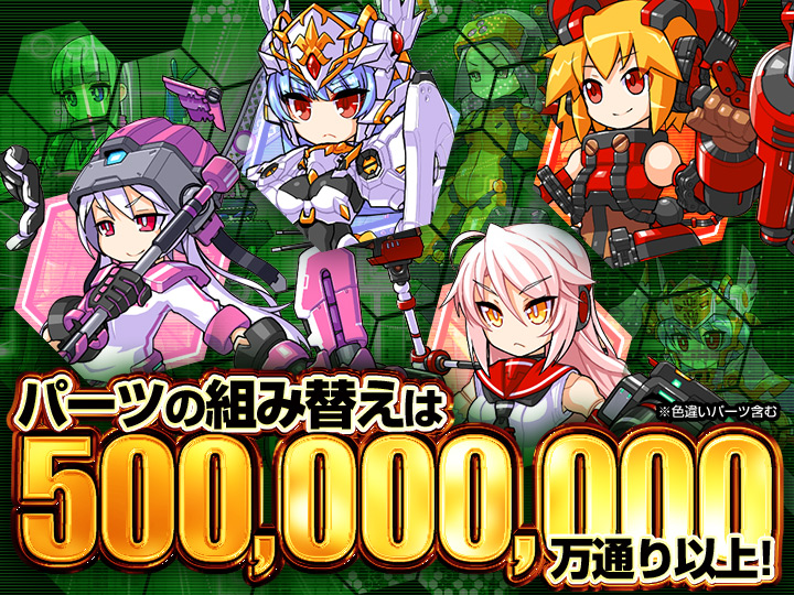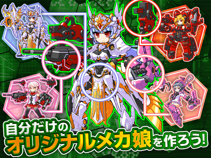 学園×メカ娘×バトル! あなただけのメカ娘を組み立てて、学園の平和を守ろう! 【メカ娘のカスタマイズが楽しい!】 パーツの組み換えに無限の可能性! 性能だけでなく、見た目も変化! 自分だけのオリジナルメカ娘を作れる! 【簡単オートバトル!】 3つの武器を選ぶだけ! 簡単操作でメカ娘が大暴れ! 【短い時間でサクサクプレイ!】 一日中張り付いてゲームなんて出来ない…そんな人でも大丈夫! メールの返信待ち時間に! コーヒー休憩タイムに! いつでも気軽に遊べる秒速プレイ!
