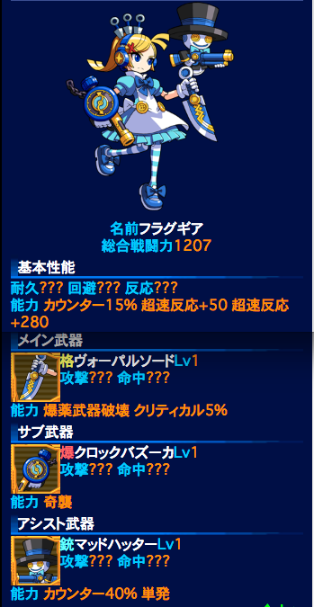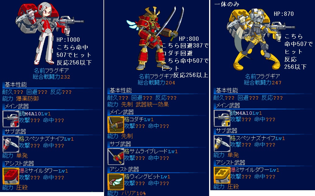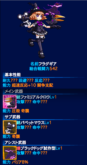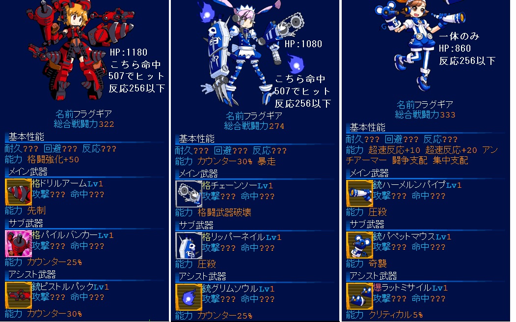 ヴァンパイアは上とほとんど同じ命中回避で、カウンターがない代わりに火力高め?>945のキツネさん情報で闘争450くらい振られてそう。銃JA受けするために耐久は1600くらいは欲しいかな。