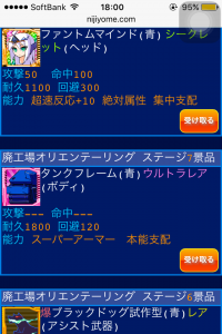 狂化パーツは単体でも序盤は心強いので無理のない範囲で集めておくといいですね。出るときはEASYでも出ますし。出ないときはEXPERT回してても出ないのですが… -