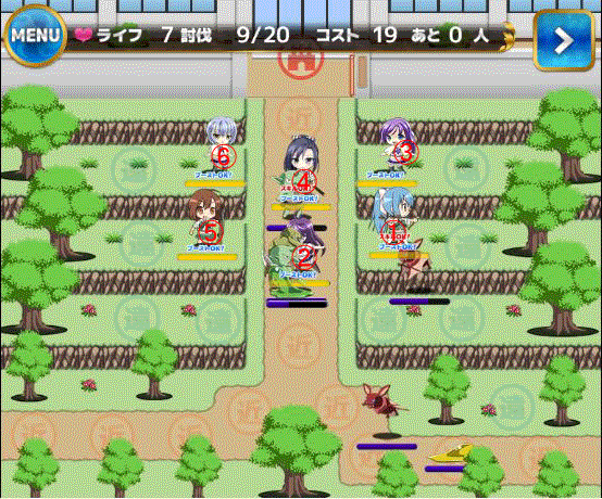 「美影」のコストが高く序盤の防衛と後半抜けられない為の壁。危なくなったら引っ込めて美影の後ろに違う壁を配置するのもあり。レベル10もあれば引っ込める必要も無いはず。