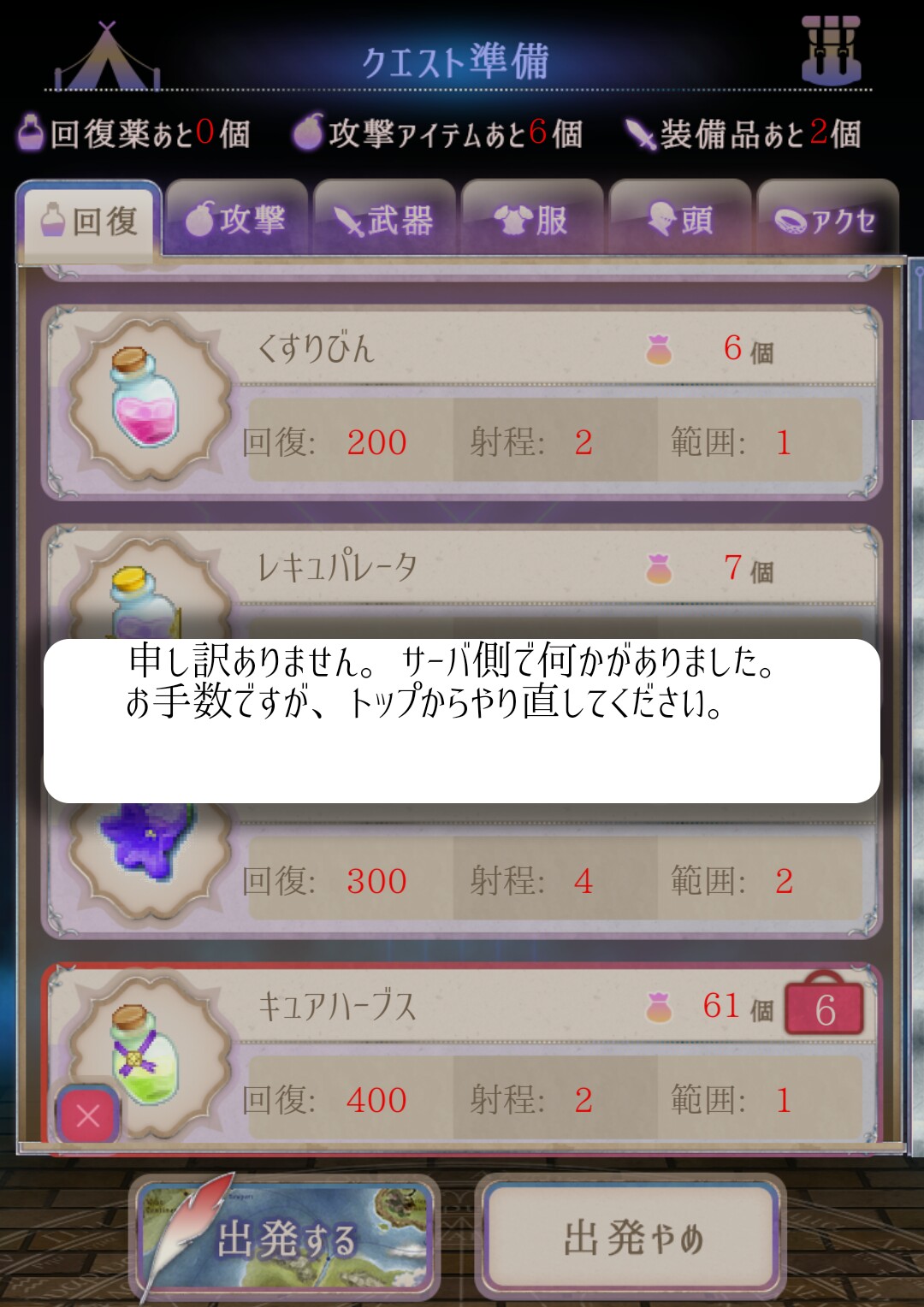 1.クエスト準備画面で選ぶ攻撃アイテムの射程と範囲の表記がおかしい。範囲は全部3で書いてある。