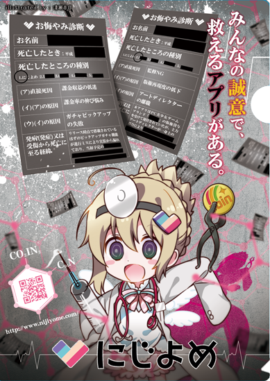 同人業界きっての無料クリアファイル配布組織であるDLsiteのノウハウとかには特に頼らずに成行きで作られたクリアファイルだ。しょうもない理由で次々とアプリが死んでいく世相を辛口のブラックユーモアで風刺している。
