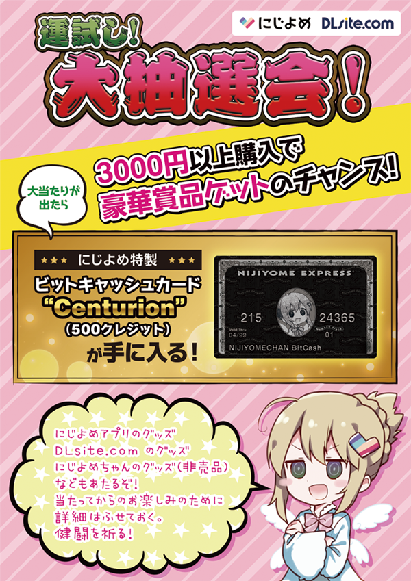 にじよめの課金にも使える特製ビットキャッシュカードのほか、DLsite.comのグッズなど、非売品ばかりを景品として用意しています。冬コミの抽選会とは賞品の入れ替えを行ったので「冬コミでやりました」という方もきっとがっかりしないラインナップになっていると思います。たぶんですが…。
